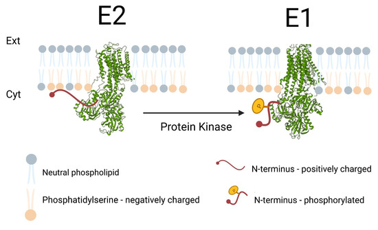 Proposed operation of the electrostatic switch mechanism in the regulation of the Na+, K+-ATPase. The E2 conformation of the enzyme is stabilised through an electrostatic interaction between positively charged lysine residues on the N-terminus and the negatively charged headgroups of phosphatidylserine on the cytoplasmic surface of the surrounding membrane. Phosphorylation of hydroxyl groups of conserved serine and tyrosine residues of the N-terminus by protein kinases introduces negative charges onto the N-terminus, weakening its electrostatic interaction with the membrane and causing its release from the membrane. This destabilises the E2 conformation of the protein and facilitates its conformational change into the E1 state. The E2 and E1 structures shown in the figure were derived from published crystal structures PDB 3B8E in the case of the E2 state [7] and PDB 3WGU in the case of the E1 state [8].