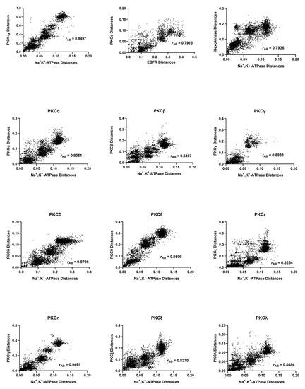 Mirror tree analyses of the Na+, K+-ATPase α1 isoform with each of the isoforms of PKC were conducted. Correlations of the pairwise distances are shown in Figure 2. The corresponding Pearson correlation coefficients, rAB; the number of common organisms, N; and the number of pairings of the common organisms (i.e., the number of data points in the correlation plots), n, are given in Table 1.