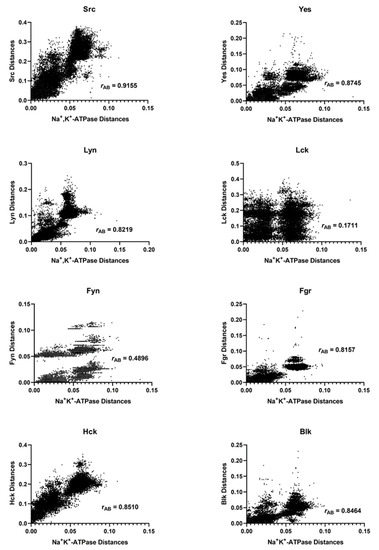 Mirror tree analyses of the Na+, K+-ATPase α1 isoform with each member of the Src kinase family were also conducted. The correlations of the pairwise distances are shown in Figure 3. The corresponding Pearson correlation coefficients, rAB; the number of common organisms, N; and the number of pairings of the common organisms (i.e., the number of data points in the correlation plots), n, are given in Table 2.