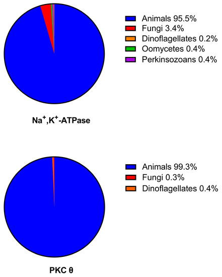 Phylogenetic distributions profiles were determined by searching for each protein of interest via the National Center for Biotechnology Information (NCBI) website www.ncbi.nlm.nih.gov/protein/ and by utilising the website’s taxonomic group output. For the Na+, K+-ATPase α1 subunit, the search was conducted via the protein’s gene name, ATP1A1, and by restricting the search to amino acid sequence lengths of 1010–2000 to avoid the inclusion of partial sequences. The search for PKC isoforms was also conducted using their corresponding gene names, i.e., PRKCA (α), PRKCB1 (β1), PRKCB2 (β2), PRKCG (γ), PRKCD (δ), PRKCE (ε), PRKCH (η), PRKCQ (θ), PRKCZ (ζ), and PRKCI (λ or ι). The Src kinase is already known to be ubiquitously expressed in vertebrate cells [18].