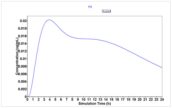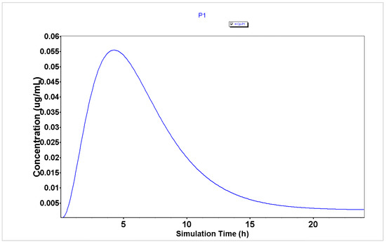Then, we simulated the plasma concentration for 24 h of peptides P1–P4 as well as their compartmental absorption and other PK parameters using the GastroPlus® software. These simulations were performed using the same parameters as previously described for 5-FU, DOXO, and PTX. These results are shown in Figure 4, Figure 5, Figure 6 and Figure 7 and Table 2.