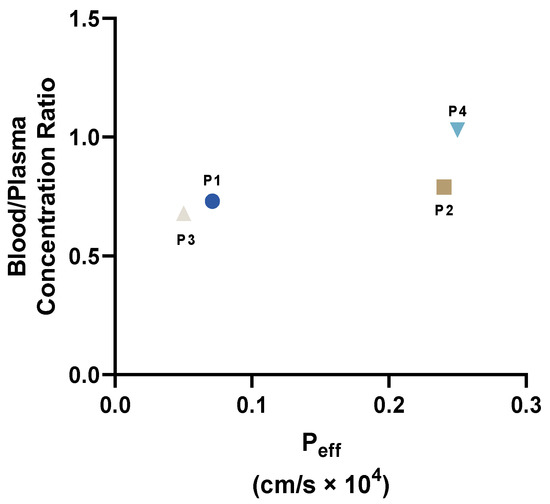 Representation of Blood/Plasma concentration ratio versus Peff for peptides P1–P4.