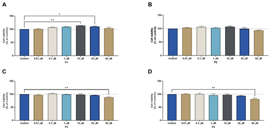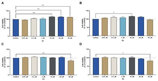 Cytotoxic results of MCF-7 after exposure to increasing concentrations of peptides (A) P1, (B) P2, (C) P3, and (D) P4 (0.01–50 μM) for 48 h. Control cells were treated with 0.01% DMSO (vehicle). Cell viability was obtained using the MTT assay, and the results are given as the mean ± SEM (n = 3). * Statistically significant vs. control (vehicle) at p < 0.05, ** statistically significant vs. control (vehicle) at p < 0.01.