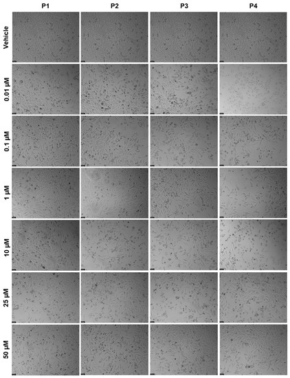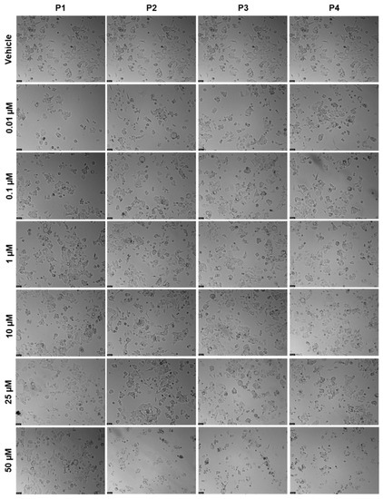 Morphological evaluation of PC-3 after exposure to increasing concentrations of P1–P4 (0.01–50 μM) for 48 h. Control cells were treated with the vehicle (0.01% DMSO). These images are representative of three independent experiments. Scale bar is 200 μM.