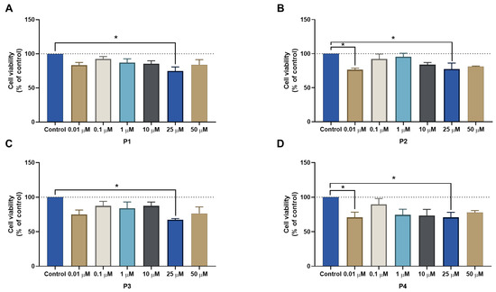 Cytotoxic results of PC-3 after exposure to increasing concentrations of peptides (A) P1, (B) P2, (C) P3, and (D) P4 (0.01–50 μM) for 48 h. Control cells were treated with 0.01% DMSO (vehicle). Cell viability was obtained using the MTT assay, and the results are given as the mean ± SEM (n = 3). * Statistically significant vs. control (vehicle) at p < 0.05.