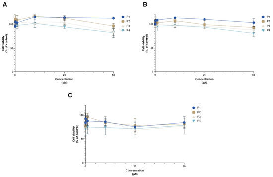 These results demonstrate that peptides P1–P4 do not induce significant anticancer effects in HT-29 colon and MCF-7 breast cancer cell lines at lower concentrations (<25 µM). In the case of PC-3 cells, these peptides are also relatively safe for this cell line and do not induce a reduction of cell viability of more than 30%. Taken together, these results also support that these peptides have an acceptable safety profile, making them ideal candidates to increase drug transport and delivery into cells.