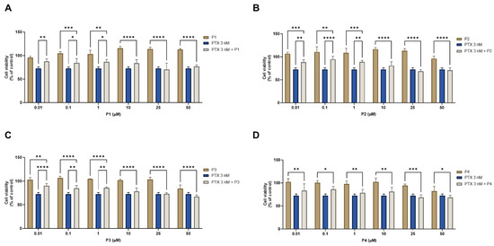Cytotoxic results of MCF-7 after exposure to combinations of 3 nM of paclitaxel with increasing concentrations of the peptides (A) P1, (B) P2, (C) P3, and (D) P4 (0.01–50 μM) for 48 h. Control cells were treated with 0.01% DMSO (vehicle). Cell viability was obtained using the MTT assay, and the results are given as the mean ± SEM (n = 3). * Statistically significant vs. drug alone at p < 0.05, ** statistically significant vs. drug alone at p < 0.01, *** statistically significant vs. drug alone at p < 0.001, **** statistically significant vs. drug alone at p < 0.0001.