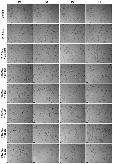 Morphological evaluation of MCF-7 after exposure to a combination of IC50 of PTX (3 nM) with increasing concentrations of P1–P4 (0.01–50 μM) for 48 h. Both substances were added at the same time. Control cells were treated with the vehicle (0.01% DMSO). These images are representative of three independent experiments. Scale bar is 200 μM.