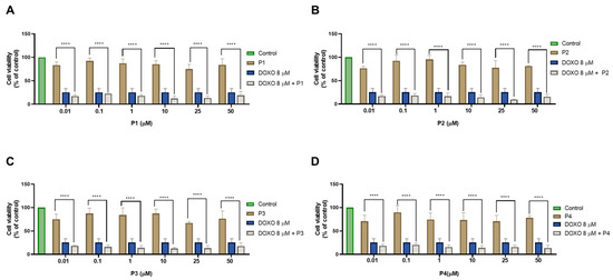 Cytotoxic results of PC-3 after exposure to combinations of 8 μM of doxorubicin with increasing concentrations of the peptides (A) P1, (B) P2, (C) P3, and (D) P4 (0.01–50 μM) for 48 h. Control cells were treated with 0.01% DMSO (vehicle). Cell viability was obtained using the MTT assay, and the results are given as the mean ± SEM (n = 3). **** Statistically significant vs. drug alone at p < 0.0001.
