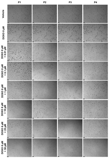 Morphological evaluation of PC-3 after exposure to a combination of 8 μM of DOXO with increasing concentrations of P1–P4 (0.01–50 μM) for 48 h. Both substances were added at the same time. Control cells were treated with the vehicle (0.01% DMSO). These images are representative of three independent experiments. Scale bar is 200 μM.