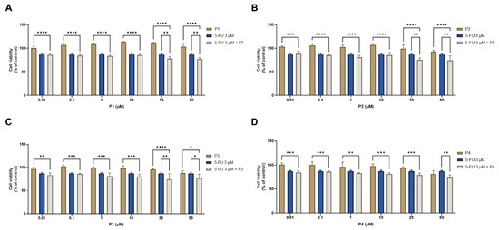 Cytotoxic results of HT-29 after exposure to combinations of 3 μM of 5-FU with increasing concentrations of the peptides (A) P1, (B) P2, (C) P3, and (D) P4 (0.01–50 μM) for 48 h. Control cells were treated with 0.01% DMSO (vehicle). Cell viability was obtained using the MTT assay, and the results are given as the mean ± SEM (n = 3). * Statistically significant vs. drug alone at p < 0.05, ** statistically significant vs. drug alone at p < 0.01, *** statistically significant vs. drug alone at p < 0.001, **** statistically significant vs. drug alone at p < 0.0001.