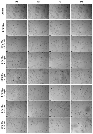 Morphological evaluation of HT-29 after exposure to a combination of the IC50 of 5-FU (3 μM) with increasing concentrations of P1–P4 (0.01–50 μM) for 48 h. Both substances were added at the same time. Control cells were treated with the vehicle (0.01% DMSO). These images are representative of three independent experiments. Scale bar is 200 μM.