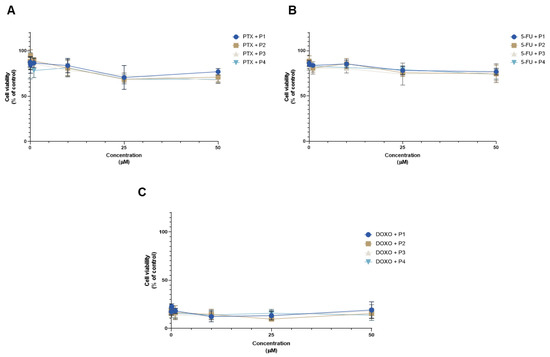 To do so, we combined increasing concentrations of peptides P1–P4 with conventional antineoplastic agents commonly used for breast, colon, and prostate cancer, namely PTX, 5-FU, and DOXO, respectively, at their IC50 (Table 3). As these drugs are widely used for cancer therapy, their IC50 value was obtained from the literature [27,28,29].