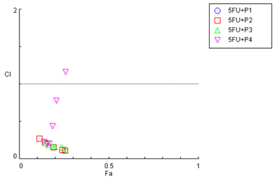 The combination index (CI) plot for the drug combinations of 5-FU plus peptides P1–P4 can be seen in Figure 23; in this plot are represented the individual values of CI vs the fractional effect (Fa). CI values higher than one indicate antagonism, equal to one indicate additivity, and lower than one indicate synergism. An Fa value equal to zero indicates no cell death whereas one indicates complete cell death. These results are also summarized in Table 4.