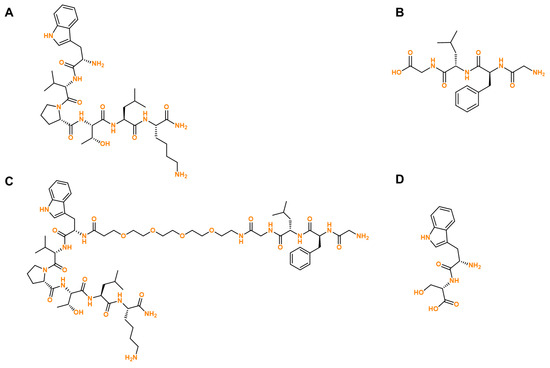 Chemical structure of the peptides evaluated in silico and in vitro in this manuscript. (A) P1, (B) P2, (C) P3, and (D) P4.