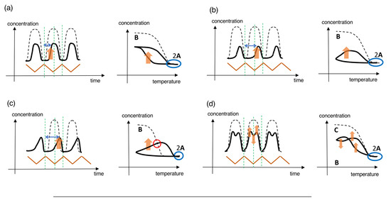Concentration oscillations can be described by their amplitude, frequency, period, and waveform, and their relationships with temperature oscillations are defined by their phase and periodicity. Phase is used to compare temperature and concentration oscillations that occur simultaneously [18]. Same-phase oscillations indicate that maximum and minimum of temperature and concentration oscillations occur at the same temperature; phase shift implies a change in the maximum and minimum in concentration oscillations versus temperature oscillations. When every cycle of a concentration oscillation provides the same amplitude, frequency, period, and waveform, such a periodic phenomenon [19] is called a stable concentration oscillation in this article [20]. When a concentration oscillation shows different amplitudes, frequencies, periods, or waveforms in repeated cycles, such a pseudo-periodic phenomenon [21,22] is called an unstable concentration oscillation [20].