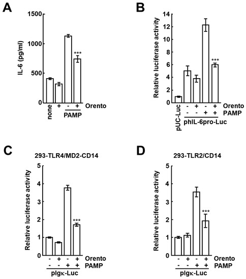The effects of orento on increase in IL-6 production and the activation of its promoter by PAMP in CAL27 cells. The protocols are described in Section 4. (A) Orento and PAMP were added to the culture media of CAL27 cells, and the levels of IL-6 in the culture media were measured by ELISA. (B) A reporter plasmid containing the IL-6 promoter linked to the luciferase gene (phIL-6pro-Luc) and a standard plasmid (pRSV-β-gal) were co-transfected into CAL27 cells. (C,D) Inhibitory effects of orento on PAMP-stimulated NF-kB-dependent transcriptional activation. pIgκ-Luc and pRSV-β-gal were co-transfected into 293-TLR4/MD2-CD14 and 293-TLR2/CD14 cells. The cells were stimulated with PAMP (100 ng/mL) for 6 h in the presence of orento (1000 μg/mL). Luciferase and β-galactosidase assays were performed. The transcriptional activities were indicated as fold values of those of pUC-Luc (a plasmid containing luciferase gene alone) (B) and of pIgκ-Luc (without orento and PAMP stimulation) (C). Bars represent the means and range of triplicate samples. ***, p < 0.001 versus stimulation with PAMP without orento.