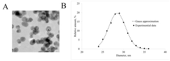 Nanoparticle characterization. (A) TEM image of the final nanoparticles. Scale bar = 20 nm; (B) the hydrodynamic diameter Fe3O4@Au NPs distribution and its approximation by the Gauss function.