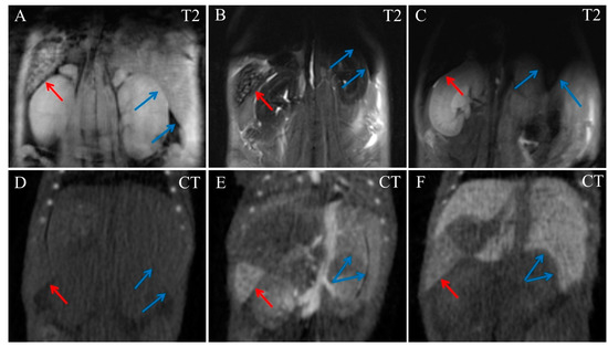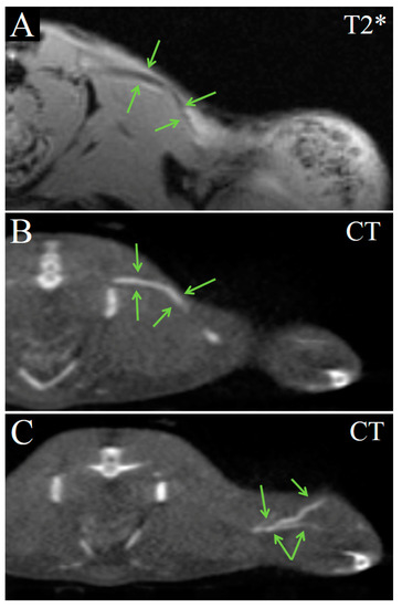 On the 17th day post injection, the tumor volume significantly increased and contained necrotic areas, which were hypointense in T2- and T2*-weighted MRI and could hardly be distinguished from contrast-enhanced areas (Figure 9A,B). In CT images, the tumor’s structure remained homogenous, and areas of nanoparticle accumulation were easier to recognize (Figure 9B,C). Nanoparticles were located mostly in connective tissue septa and tumor capsules. Most likely, such a specific pattern formed due to the absorption of the nanoparticles by tumor-associated macrophages, with the subsequent migration of these cells to the capsule and accumulation within. Contrast-enhanced areas in the tumor became enlarged, but only minimally hyperdense and vague, without precise margins. The decrease in tumor tissue’s radiodensity was possibly related to enlargement of the tumor volume and, thus, to a decrease in nanoparticle concentration. Blood vessels did not contain any contrast agent at 17 days, all over the mouse body.