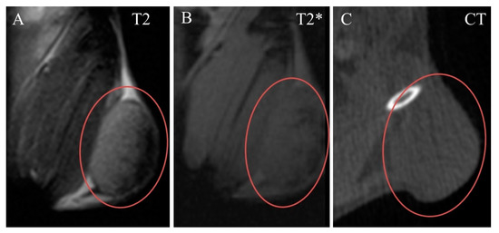The tumor was clearly seen in CT and MRI. It was nearly ellipse-shaped and approximately 7 × 7 × 5 mm in size. Native images of the tumor were slightly hyperintense in T2-weighted, and nearly isointense in T2*-weighted MRI, compared to adjacent muscle (Figure 4A,B). Its structure was nearly homogenous, with a small subcapsular T2-hypointense portion (Figure 4A). In CT, the tumor was isodense to muscle and completely homogenous (Figure 4C).