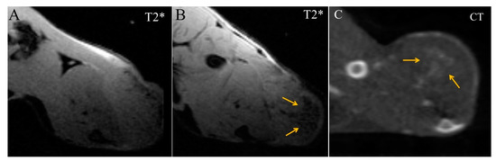 Transversal images of Ca755 mammary carcinoma. (A) native T2* MRI; (B) T2* MRI 16 min post injection of Fe3O4@Au; (C) CT image 22 min post injection of Fe3O4@Au. Arrows mark a triangular-shaped area of accumulation.