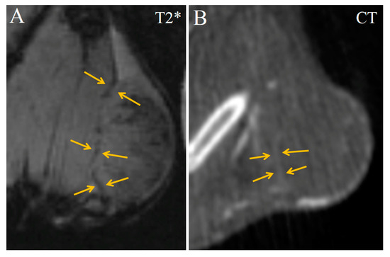 Though both CT and MRI modalities allow imaging of the internal anatomical structures of a studied object, the obtained diagnostic information is quite different. A CT image is the attenuation map of different structures in the studied object; thus, organs that attenuate X-rays very differently (e.g., bones and soft tissues) can be clearly distinguished in CT images, and vice versa—if two adjacent anatomical structures have similar attenuation properties (e.g., a tumor and muscles), it is difficult to differentiate them from each other without additional tools. An MRI image is the map of protons’ nuclear magnetic relaxation rate, whose value depends on the density of the protons (i.e., hydrogen) in a particular region and on their chemical environment. This allows MRI to distinguish different types of soft tissue, which is a valuable property for diagnostics. However, if the imaged region contains little hydrogen, it cannot be visualized properly. For MRI, these “stealth” matter are mainly air and bones [17,18]. CT and MRI provide rather opposing imaging abilities and well complement each other. Using the diagnostic capabilities of both modalities is especially important for oncology, in which tumor growth provides a new and unpredictable anatomical structure (a tumor node) and can cause changes in other anatomical structures, making them difficult to recognize [19,20,21].