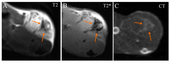 Native coronal images of Ca755 mammary carcinoma. (A) T2 MRI; (B) T2* MRI; (C) CT image. The tumor is located on the right hind leg.