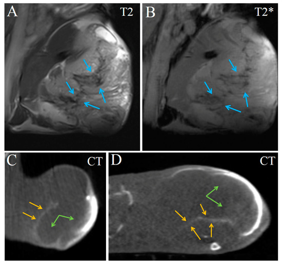 Images of Ca755 mammary carcinoma at 17 days post injection of Fe3O4@Au. (A) T2 MRI, coronal image; (B) T2* MRI, coronal image. Blue arrows mark necrotic regions; (C) CT, coronal image; (D) CT, transversal image. Orange arrows indicate the connective tissue septa, green arrows indicate the area of nanoparticle accumulation.
