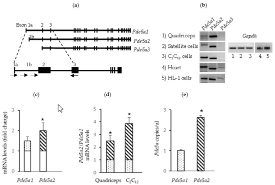 Both in skeletal muscles and in C2C12 myotubes, isoform Pde5a2 was expressed at higher levels compared with isoform Pde5a1, as documented by qPCR and droplet digital PCR (ddPCR) (Figure 1d,e).