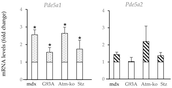 Increased levels of Pde5a1 mRNA were also present in the skeletal muscle of Sod-G93A mice, reflecting a model of neuromuscular disorder, such as ALS (amyotrophic lateral sclerosis) [42], in which skeletal muscles developed progressive muscle atrophy and fibrosis. In other conditions of atrophy, such as muscles from mice lacking ataxia telangiectasia, Atm-ko [43], and in muscles from streptozotocin-induced diabetes mice (Stz) (Figure 2), an upregulation of Pde5a1 was observed. Concerning the Pde5a2 isoform RNA levels, no significant changes occurred in the different samples tested.