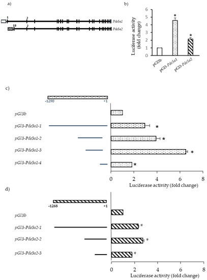 Analysis of Pde5a1 and Pde5a2 promoter activity. (a) Scheme of Pde5a gene organization; dotted and striped boxes represent the putative promoter regions. (b) NIH-3T3 cells were transiently transfected with each of the plasmids containing the firefly luciferase reporter under the control of Pde5a1 and Pde5a2 promoter (b) or several fragments of these promoters (c,d). Results are expressed as the fold change activity relative to that observed with the pGl3 basic empty plasmid. Values represent the mean ± SD of at least n = 4 different experiments performed in triplicate. * Indicates statistical significance of promoter constructs with respect to empty vector (t-test: p < 0.05).