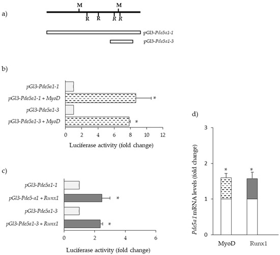 In myogenic cells, the overexpression of RUNX1 and enhanced Pde5a1 transcriptional activity were detected (Figure 4c). In line with promoter studies, increased levels of Pde5a1 RNA were detected in C2C12 cells overexpressing MyoD and Runx1 (Figure 4d).