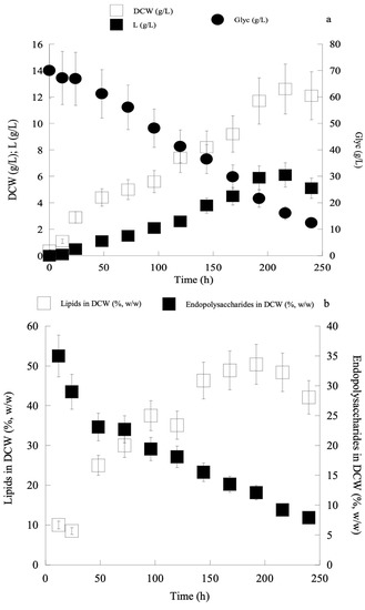 Given that the most suitable combination of nitrogen sources amenable to boost the process of lipid accumulation in C. curvatus ATCC 20509 was that of yeast extract (1.0 g/L) and peptone (2.0 g/L), in the next and final step of lipid production optimisation it was decided to study the effect of the Glyc0 concentration (and also the effect of the initial C/N molar ratio) when constant initial nitrogen concentration (yeast extract at 1.0 g/L and peptone at 2.0 g/L) was added into the medium. Recent investigations employing the currently used C. curvatus ATCC 20509, during its cultivation on second cheese-whey supplemented with cheese-whey lactose, have demonstrated the very high significance of the initial carbon source (lactose) concentration and the initial C/N molar ratio upon the bioprocess [42]. Therefore, in the current investigation, different Glyc0 concentrations (≈30, ≈50 and ≈70 g/L) were added into the medium at constant nitrogen concentration, and the effect of both the increasing Glyc0 concentrations and initial C/N molar ratios was studied (Table 3). From the obtained results, it is observed that the more the Glyc0 concentration increased, the less the maximum DCW values were recorded. This could be due to substrate (glycerol) inhibition exerted towards the strain, due to the increased Glyc0 concentrations found in the medium, in accordance with the results reported by Meesters et al. (1996) [43]. Moreover, from the obtained results, it can be assumed that the more growth was performed under carbon-excess conditions (high initial C/N molar ratios) the more SCOs were produced inside the yeast cells (lipids increased at both absolute; g/L, and relative; g of lipid per g of DCW, values). Specifically, at Glyc0 ≈ 70 g/L (C/N ≈ 80 moles/moles), lipids up to 50% w/w in DCW were produced (SCOmax = 6.1 g/L), although total DCW values were smaller compared to the trials with the lower Glyc0 concentrations imposed (Table 3). Finally, as in most of the previously presented trials, the relative values of polysaccharides (g/g of total DCW) presented increased values at the earlier growth steps, decreasing significantly as the growth proceeded, simultaneously with the increase of lipids in DCW values, in accordance with literature reports for a few oleaginous yeast species [35,39,40]. One of the characteristic cases (growth at Glyc0 ≈ 70 g/L; C/N ≈ 80 moles/moles) is illustrated in Figure 1a,b.