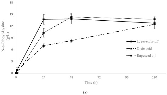 New findings on aminoacylase ability, substrate specificity and enzymatic performance are presented. More precisely, it is for the first time stated that aminoacylases can perform N-acylation only when free FAs are used as ADs, hence a microbial oil should first be hydrolysed. Based on the new parameter, viz., Sf, aminoacylases have a substrate specificity towards palmitic acid, compared to oleic and linoleic acid. Aminoacylases catalyse the N-acylation reaction of lysine and produce amino acid biosurfactants from SCO in aqueous mediums and present higher productivity and product titre than with vegetable oil, which is a food-competitive “feedstock”. Finally, CALB proved to have substrate specificity towards linoleic acid compared to oleic acid and palmitic acid. Understanding such characteristics of an enzyme could significantly contribute to the development of new highly customised bioprocesses, with maximum productivity and selectivity. Further work is underway to develop continuous coupled microbial-enzymatic bioprocesses and solvent-free extraction methods of microbial oils.