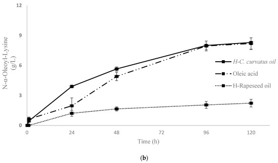 Furthermore, in order to discriminate products that occurred from different N-acylation positions of lysine, ε- and α-oleoyl-lysine were analysed as standards. The qualification was based on their Mass Spectrometry (MS2) profiles, which were generated by the fragmentation of the parent ions. Fragmentation of ε-oleoyl-lysine led to one major daughter ion (m/z = 348) corresponding to [(Oleoyl-lysine) − H2O − COOH + H+]. The enzymatic reaction of CALB was selective, favouring the production of ε-oleoyl-lysine, verifying the results of a previous study [46] (Figure 3). Figure 2a demonstrates the kinetic of product synthesis and the different ε-oleoyl-lysine concentrations and productivity, depending on the oleic acid’s origin. In the cases of Cryptococcus curvatus ATCC 20509 oil (Cu) and rapeseed oil (Rap) product concentration was around 14 g/L, while productivity was 0.57 g/L/h and 0.43 g/L/h respectively after 24h. On the contrary, in the case of free oleic acid, product concentration was 12.5 g/L, but a significantly lower productivity was achieved, namely, 0.29 g/L/h after 24 h. It is of major interest to focus on the level of productivity of this bioprocess, as Cu has proved to be the most suitable substrate for enzymatic acylation by CALB. The plateau was observed at approximately 14 g/L, corresponding to an 80% yield of lysine to N-ε-oleoyl-lysine. The lower product titre and productivity in the case of oleic acid may be due to the presence of water in the medium. As each mole of product generates one mole of water, the thermodynamic equilibrium of CALB can be driven from synthesis (e.g., organic medium) to hydrolysis (aqueous medium). This phenomenon is not observed when FAs are found in triacylglycerol structure (e.g., Cu, Rap) since, each time a FA is liberated, one mole of water is consumed.