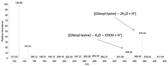 After the production and the partial purification of aminoacylases, their final protein concentration was measured at 9 g/L by Bradford assay. Recently isolated aminoacylases from Streptomyces ambofaciens ATCC 23877 were selected for their ability to perform N-acylation of α amino group of amino acids or peptides [31]. Fragmentation of α-oleoyl-lysine led to one major daughter ion (m/z = 375.4) corresponding to [(Oleoyl-lysine) − 2H2O + H+] and one minor daughter ion (m/z = 348.35) corresponding to [(Oleoyl-lysine) − H2O − COOH + H+]. The experimental results, presented in Figure 4, confirm that the enzymatic reaction by aminoacylases was selective, favouring the production of α-oleoyl-lysine. At first, the effect of the initial form of AD on the ability of aminoacylases to carry out the N-acylation of lysine was investigated. More specifically, in one case, the ADs were in free form (hydrolysed C. curvatus oil), and in the other, they were in a triacylglycerol structure (C. curvatus oil). The results of HPLC analysis indicated that only when AD was in free form N-acylation occurred and that a non-hydrolysed oil cannot be used by aminoacylases as an acyl carrier in order to perform an N-acylation. This finding determined the approach adopted to develop the next bioprocesses with this enzyme. Thus, a stepwise process was required, in which microbial oil from C. curvatus (Cu) and rapeseed oil (Rap) were hydrolysed to release the free FAs from the triacylglycerol structure and make them available for the acylation reaction by aminoacylases. The hydrolysis step was also performed enzymatically, with CALB in an aqueous medium. In the second step, hydrolysed oils were used as AD for the N-α-acylation of lysine by aminoacylases. The synthesis of α-oleoyl-lysine was successfully performed, when the ADs were found in hydrolysed C. curvatus oil (H-Cu), in hydrolysed rapeseed oil (H-Rap) and in free oleic acid (Figure 2b). The highest concentration of α-oleoyl-lysine was around 8.3 g/L and occurred in the cases of H-Cu and free oleic acid at 120 h, while productivity at 24 h was 0.16 g/L/h and 0.08 g/L/h, respectively. Product concentration with H-Rap was only 2.2 g/L. It is very important to highlight the fact that a hydrolysed microbial oil (H-Cu) gave almost the same product concentration and three times higher productivity compared to free oleic acid and almost four times higher product concentration than a vegetable oil (H-Rap). This is a very promising result, considering that the bioprocess has not been yet optimised, even though its productivity is much lower than that of CALB. Therefore, an approach for increased activity of aminoacylases, as a metalloenzyme, could be the addition of cobalt ions to the reaction medium [32].
