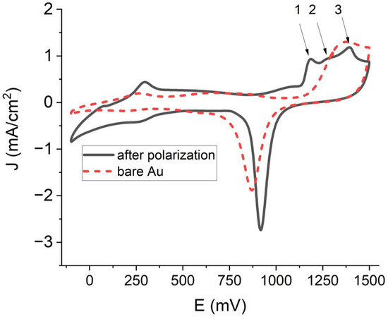 The polycrystalline structure of the gold electrode was formed before each set of experiments, which we identified according to the representative peaks in voltammograms obtained by the CV method (Figure 1). For this purpose, the potential was cycled from −0.1 V to 1.5 V at a scan rate of 0.1 V/s in 1 M H2SO4 solution until the system stabilized. The smooth voltammogram with a cathodic peak at ~900 mV is characteristic of the bare gold electrode (Figure 1, dashed line, red). The 1 M H2SO4 solution was changed as necessary between steps. Afterwards, the electrode was electrochemically polished by creating a 2 V potential for 3 min in 1 M H2SO4 using the chronoamperometry technique. The representative peaks of the polycrystalline structure of the gold on the voltammogram were identified (Figure 1, smooth line, black). The change in the electrode due to the electrochemical treatment can be seen from the change in the voltammograms before (Figure 1, dashed line, red) and after (Figure 1, smooth line, black) electrochemical polarization. We observed a significantly increased cathodic peak at ~900 mV and the formation of new anodic peaks at 1180 mV (1st peak), 1280 mV (2nd peak), and 1390 mV (3rd peak) (Figure 1, smooth line, black).