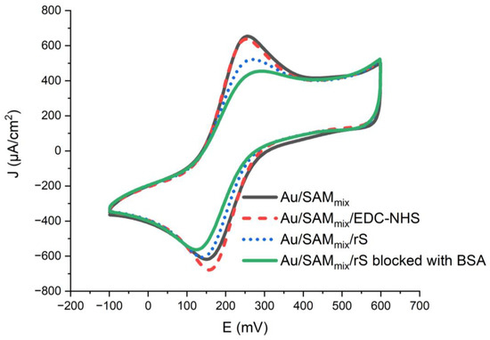 We tested a discrete electrode at different formation steps using the CV technique (Figure 3). Compared with the Au/SAMmix electrode, the Au/SAMmix/EDC-NHS electrode displayed an increased cathodic current, which agrees with the observations reported by other authors [35]. By forming the Au/SAMmix/rS electrode, we observed notably reduced cathodic and anodic current densities with a further reduction after blocking the system with BSA.