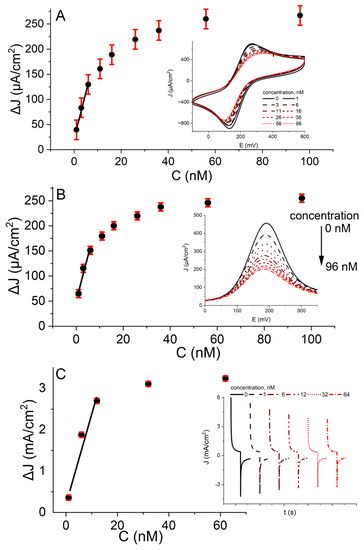 The evaluation of anti-rS antibody interaction with the rS protein, which was immobilized on the polycrystalline gold electrode, was performed by three electrochemical methods: cyclic voltammetry (A), differential pulse voltammetry (B), potential pulsed amperometry (C). Measurements were performed in PBS solution (pH 7.4) while adding 2 mM of [Fe(CN)6]3− and 2 mM of [Fe(CN)6]4− as a redox probe; the current density was calculated taking into account the surface area of the electrode (0.071 cm2).