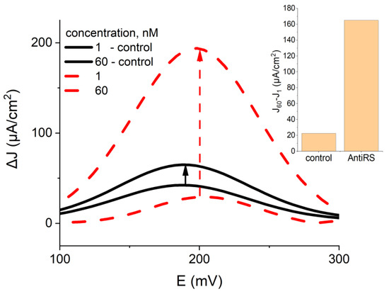 To assess the specificity of the system, we tested the reaction of the Au/SAMmix/rS electrode to the incubation in a blood serum sample of a person who was not infected by SARS-CoV-2 and was not vaccinated against COVID-19 (Figure 5, black line) and compared the results to the interaction observed when tested with the blood serum of an individual that was infected with SARS-CoV-2 and vaccinated against COVID-19 (Figure 5, red dashed line). Throughout the test, we observed all the characteristic peaks at expected positions. We tested two discrete Au/SAMmix/rS electrodes blocked with BSA. After the blocking the system with BSA we calculated their current density values and used them as our base value, which we subtracted from the values determined during further measurements to calculate the biosensor response. We then tested the respective electrode interaction with two sets of 1 nM and 60 nM blood serum samples, one with anti-rS antibodies and the other without anti-rS antibodies. We observed current density changes in both systems. The system tested with blood serum without anti-rS antibodies expressed a current density delta of ~20 µA/cm2; an equivalent system tested with anti-rS antibodies displayed a change in current density of ~160 µA/cm2, around eight times larger. From testing, we can observe some nonspecific bonding in the system; however, the response was significantly lower than that determined after the interaction with the serum sample of the person who was not infected by SARS-CoV-2 and was not vaccinated against COVID-19.