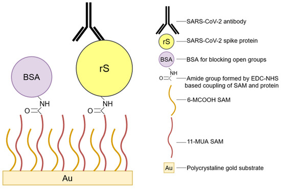 In addition to the electromechanical treatment, there are other ways to change the surface properties. The chosen electrode materials need to be bio-compatible and easily functionalized; a commonly used example that fits these criteria could be chitosan [25]. A notable example would be creating a multi-layer chitosan/alginate structure utilizing different pH values during the formation process [26]. SAMs are used to modify the electrode surface using fetal bovine serum on a H/O-terminated diamond [27] or human immunoglobulin G (IgG) [28]. SAMs based on alkanethiols and dialkanethiols formed on gold electrodes are used in the design of various sensing systems [29,30]. Alkanethiols chemically absorb on gold; however, the details of the bonding between the sulfur head group and gold is still a subject for debate [31]. It was observed that among different types of SAMs, the ones with terminal carboxyl and methyl groups were the most reliable for establishing highly effective links with the spike protein of the SARS-CoV-2 virus [32,33].