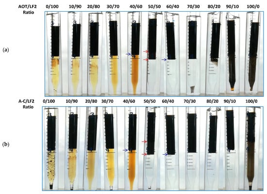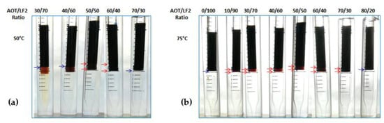 The blends were also evaluated at 50 °C and 75 °C. The results are shown in Figure 2 and Figure 3 for AOT/LF2 and A-C/LF2, respectively. In the case of the AOT/LF2 blend, the range of ratios where Winsor III systems were found increased with temperature. At 50 °C, triphasic systems were found from 50 to 60 wt% AOT, and at 75 °C, from 10 to 70 wt% AOT (Figure 2). However, the volume of the middle phase slightly reduced with temperature. Similar behavior was found for the A-C/LF2 blend: in a range between 10 and 40 wt% A-C, small Winsor type III systems were found (Figure 3). No further studies were carried out at 75 °C since both blends showed loss of efficiency to solubilize water and oil phases.