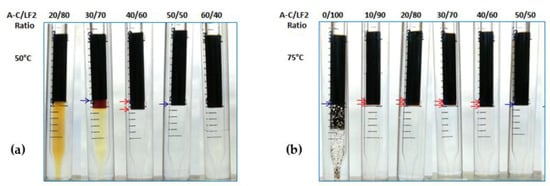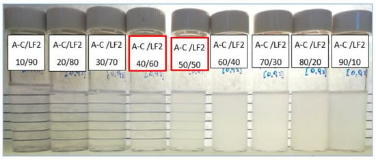 In the case of A-C/LF2, the stability evaluation was performed from 10 wt% to 90 wt% A-C. The blend remained translucent during 4 weeks in the range of interest from the 40/60 to 50/50 A-C/LF2 ratio (Figure 7).