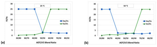 Solubilization parameters (Vi/Vs) for AOT/LF2 blend at (a) 25 °C and (b) 50 °C.