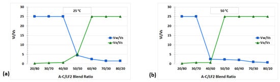 Solubilization parameters (Vi/Vs) for A-C/LF2 blend at (a) 25 °C and (b) 50 °C.