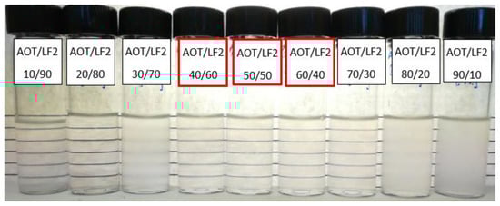 The stability of the aqueous formulations was initially evaluated at 1 wt% blend (AOT/LF2 and A-C/LF2) concentration at room temperature. During the evaluation, the A-C/LF2 concentration was reduced from 1 to 0.9 wt% to improve the stability of the blend. Figure 6 shows the results of this test with different AOT/LF2 ratios, from 10 wt% to 90 wt% AOT. Around the 50/50 blend ratio, the formulations remained translucent during the 4 weeks of the test.
