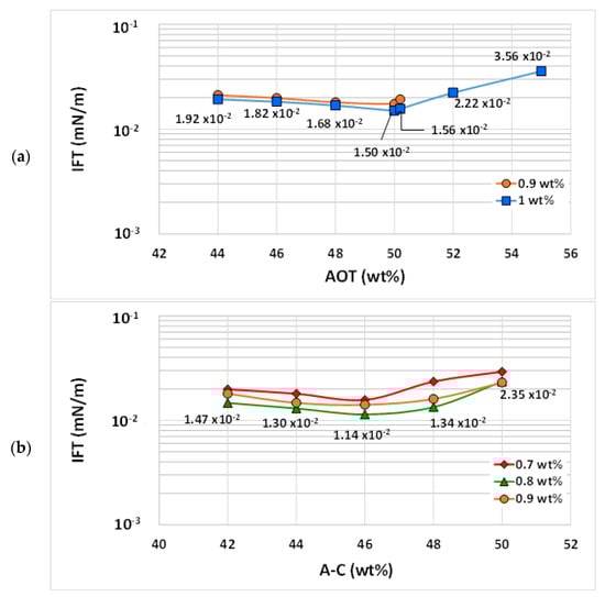 The lowest IFT value achieved with the AOT/LF2 blend was 1.50 × 10−2 mN/m at the 50/50 blend ratio and at 1 wt% concentration in SSW. A slight increase in the IFT values was observed when the blend concentration was reduced to 0.9 wt%. In the case of the A-C/LF2 blend, the lowest IFT value was 1.14 × 10−2 mN/m, observed at a 46/54 ratio (the composition in the ternary blend was AOT20.7wt%/[C12mim]Br25.3wt%/LF254wt%) and at 0.8 wt% concentration in SSW. A higher concentration (0.9 wt%) and a lower one (0.7 wt%) were also evaluated, resulting in slightly higher IFT values.