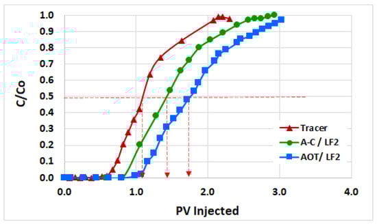The results of the dynamic adsorption tests carried out in carbonate rocks are shown in Figure 9. This figure shows the relative concentrations (C/C0) of the tracer and the optimal blends in the effluent as a function of the injected pore volume (PV) at room conditions. The tracer front achieved 50% of the initial concentration (C/C0 = 0.5) at 1.09 PV injected, while for the optimal blends AOT/LF2 and A-C/LF2 this concentration ratio was achieved at 1.75 and 1.43 PV, respectively. Using Eq. 2, the dynamic adsorptions were estimated as 0.42 mg/g of rock for AOT/LF2 and 0.21 mg/g of rock for the A-C/LF2 blend.
