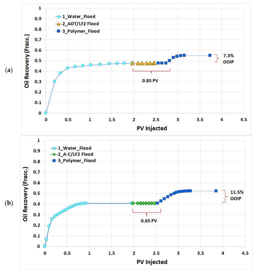 Table 2 presents a summary of the two core flooding tests, and Figure 10 shows the evolution of the oil recovery during water, surfactant, and polymer flooding. It can be seen that in the case of the AOT/LF2, oil production started after the injection of 0.85 PV of chemicals, whereas only 0.65 PV was required with A-C/LF2. This might be due to the higher adsorption found with the AOT/LF2 blend (Section 2.1.4).