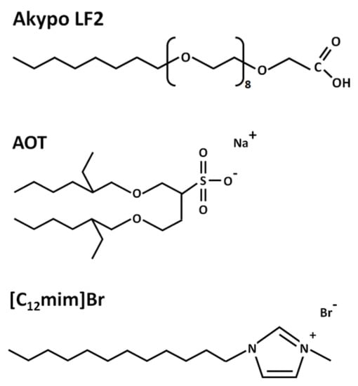 The AOT surfactant, dioctyl sulfosuccinate sodium salt, and potassium iodide (KI) were purchased from Sigma-Aldrich with purities of ≥ 97 wt% and > 99 wt%, respectively. The surfactant polyoxyethylene(8) octyl ether carboxylic acid (C8EO8OCH2COOH), commercially named Akypo LF2, was kindly provided by KAO Chemicals with a purity ≥ 98 wt%. The SAIL 1-dodecyl-3-methylimidazolium bromide ([C12mim]Br) was purchased with a purity > 98 wt% from Iolitec. Figure 11 presents the chemical structures of the surfactants and the SAIL.